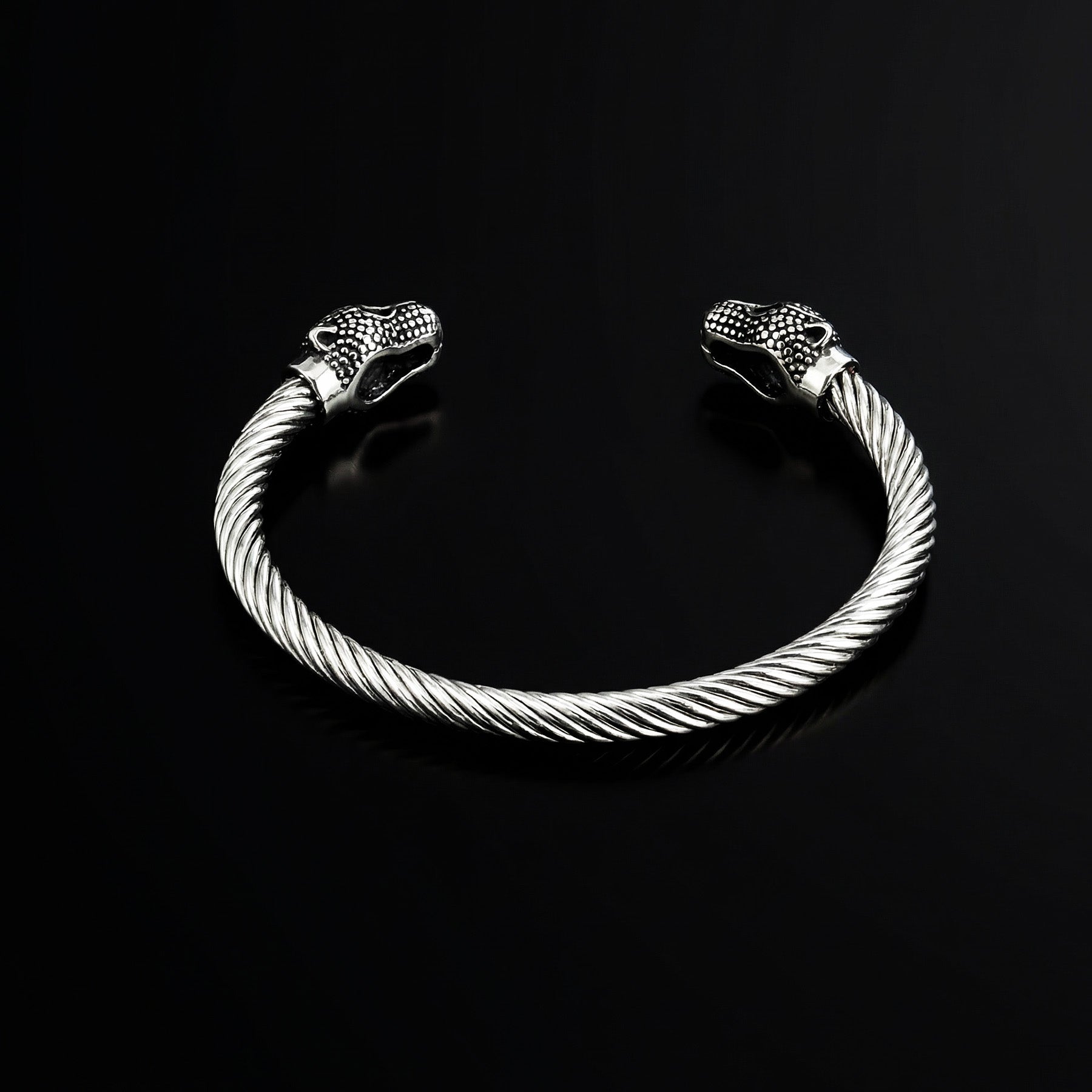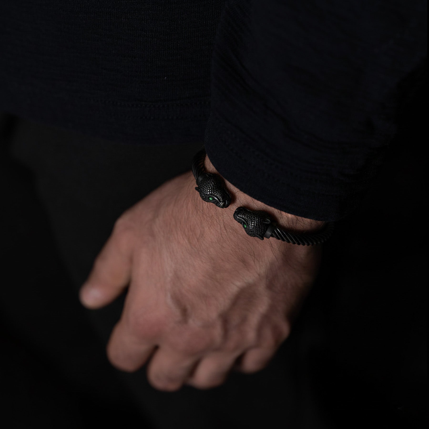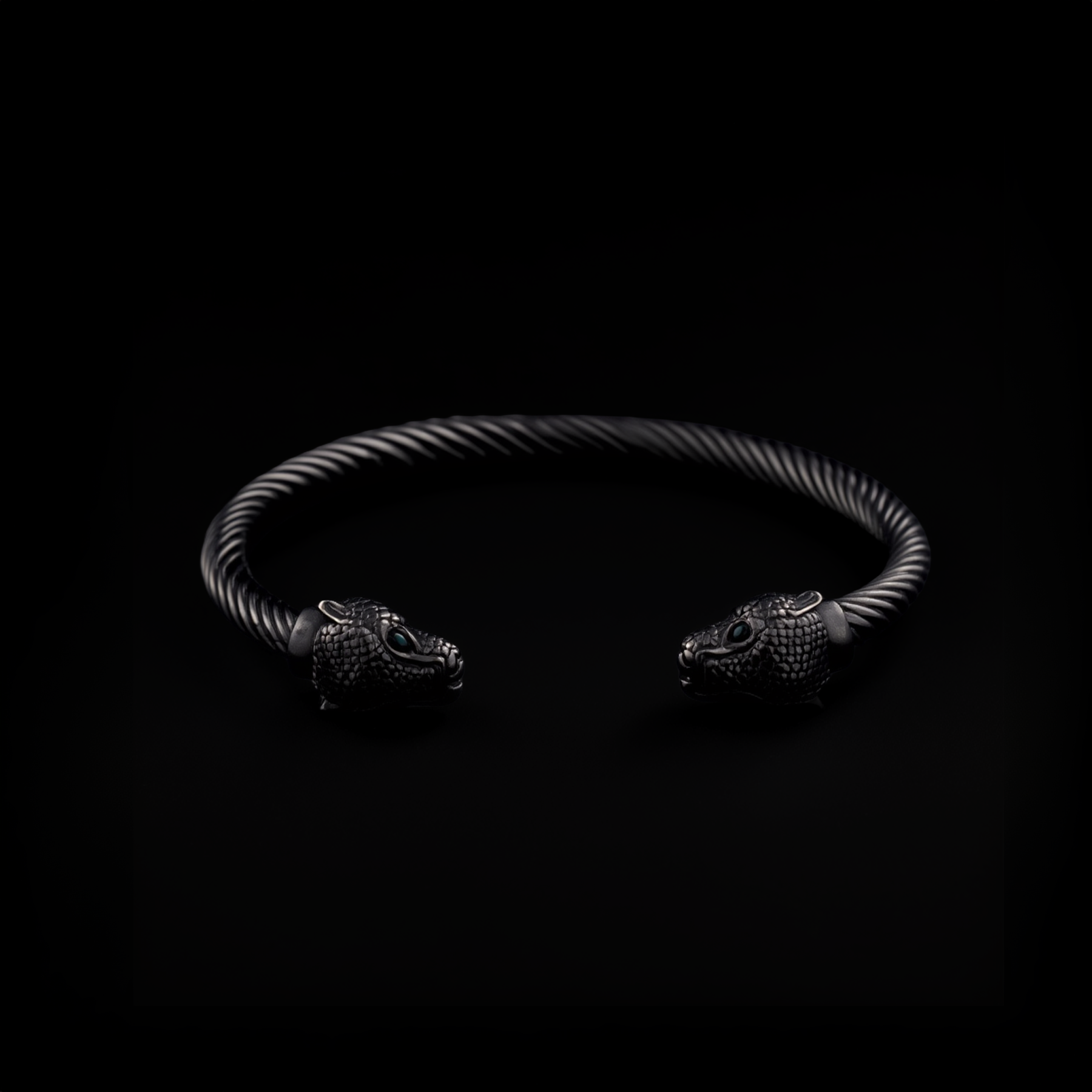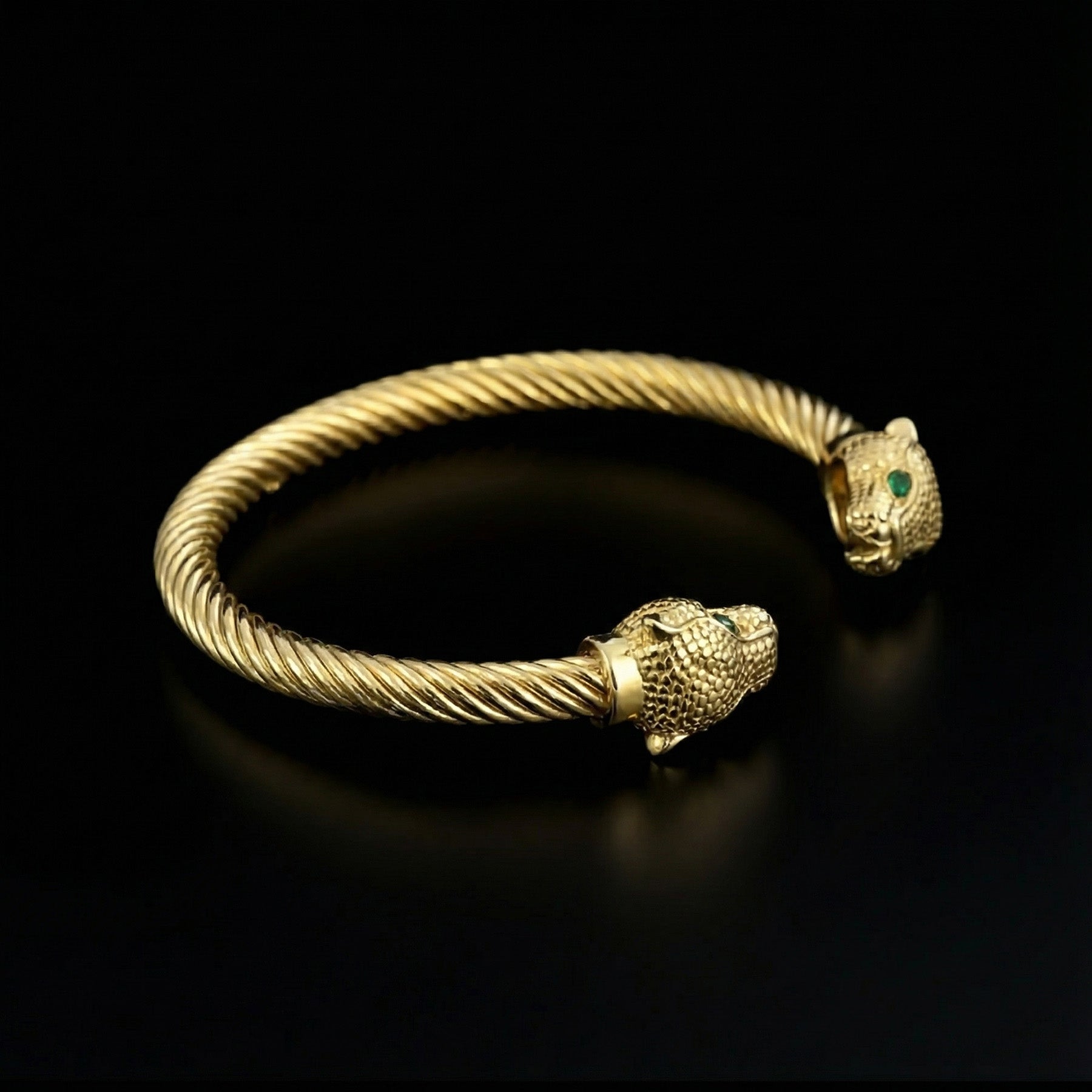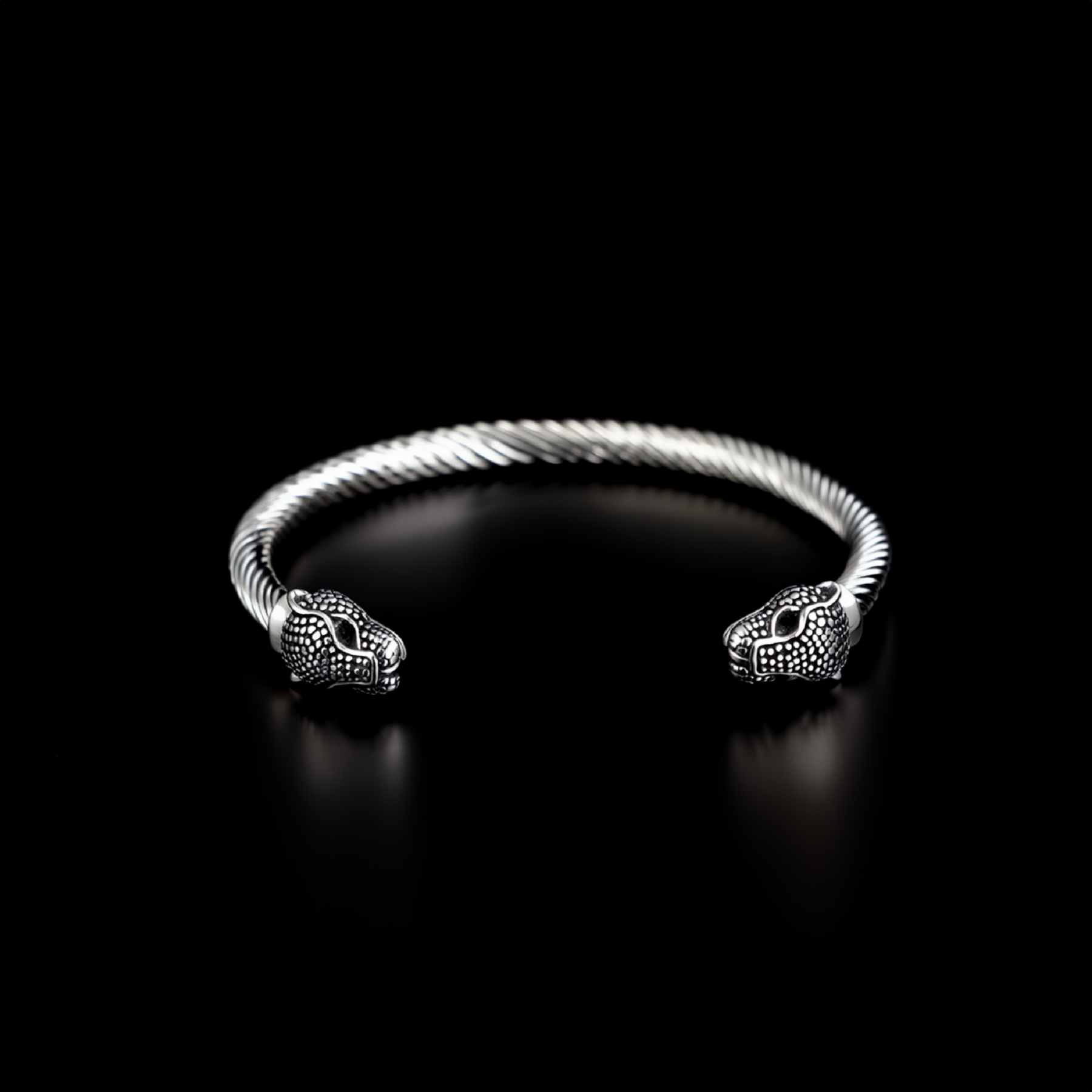 Edler Armreif aus Edelstahl mit zwei detailreich gearbeiteten Leopardenköpfen.