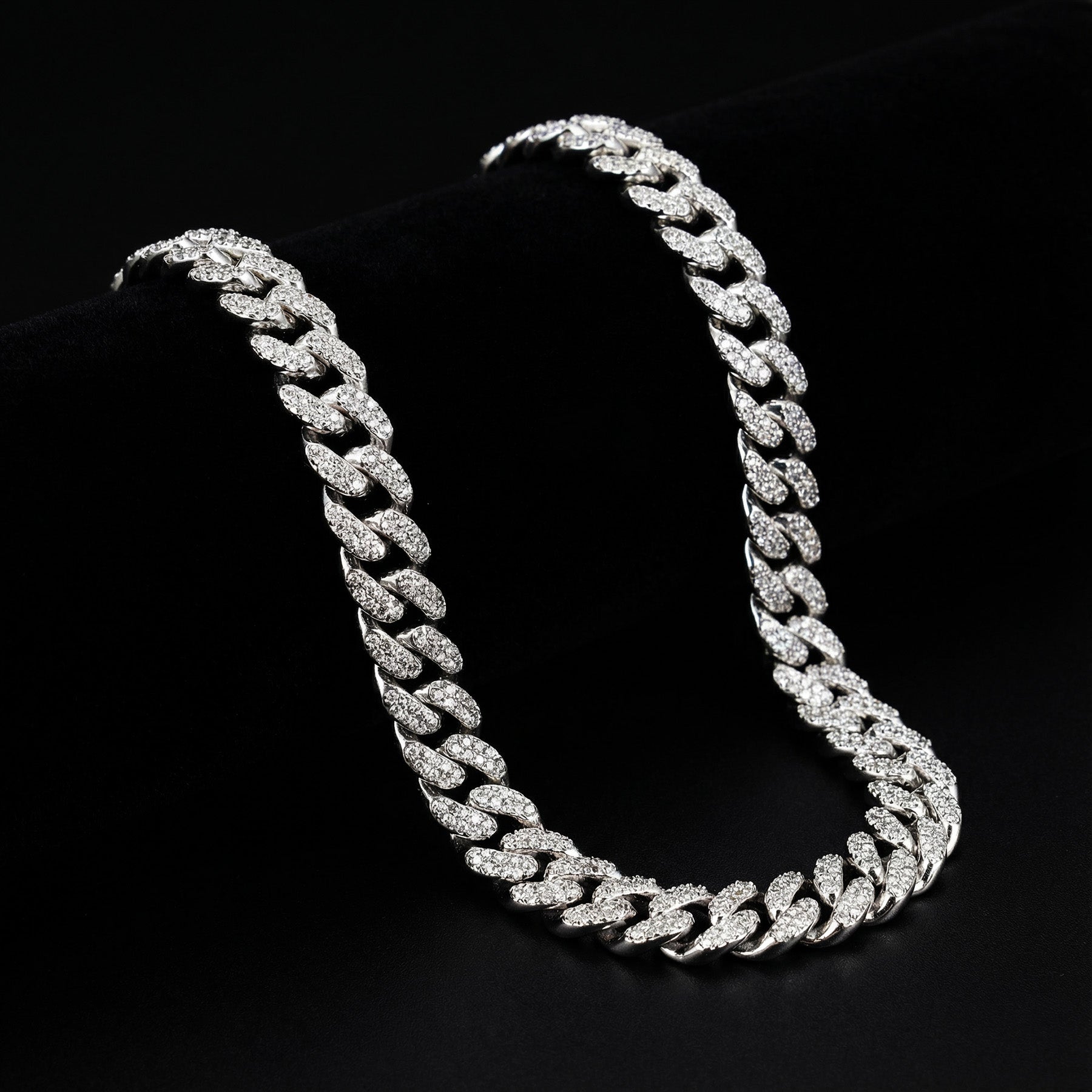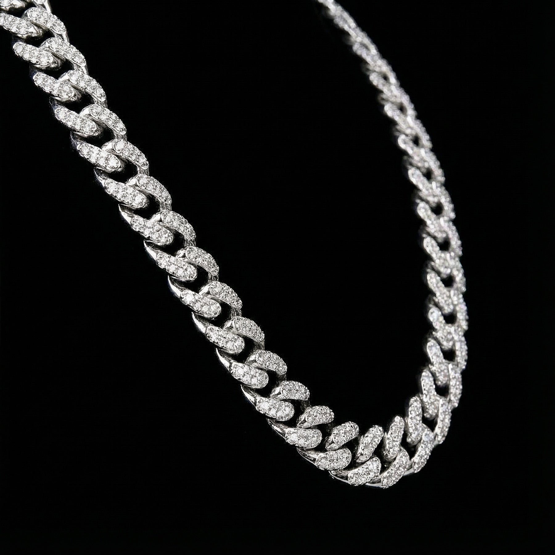 Die Miami Cuban Kette ist ein echtes XXL-Statement. Massiv, iced-out und maximal auffällig – ideal für alle, die im urbanen Style keine Kompromisse machen. Die klaren Formen und funkelnden Steine setzen jeden Look sofort in Szene.