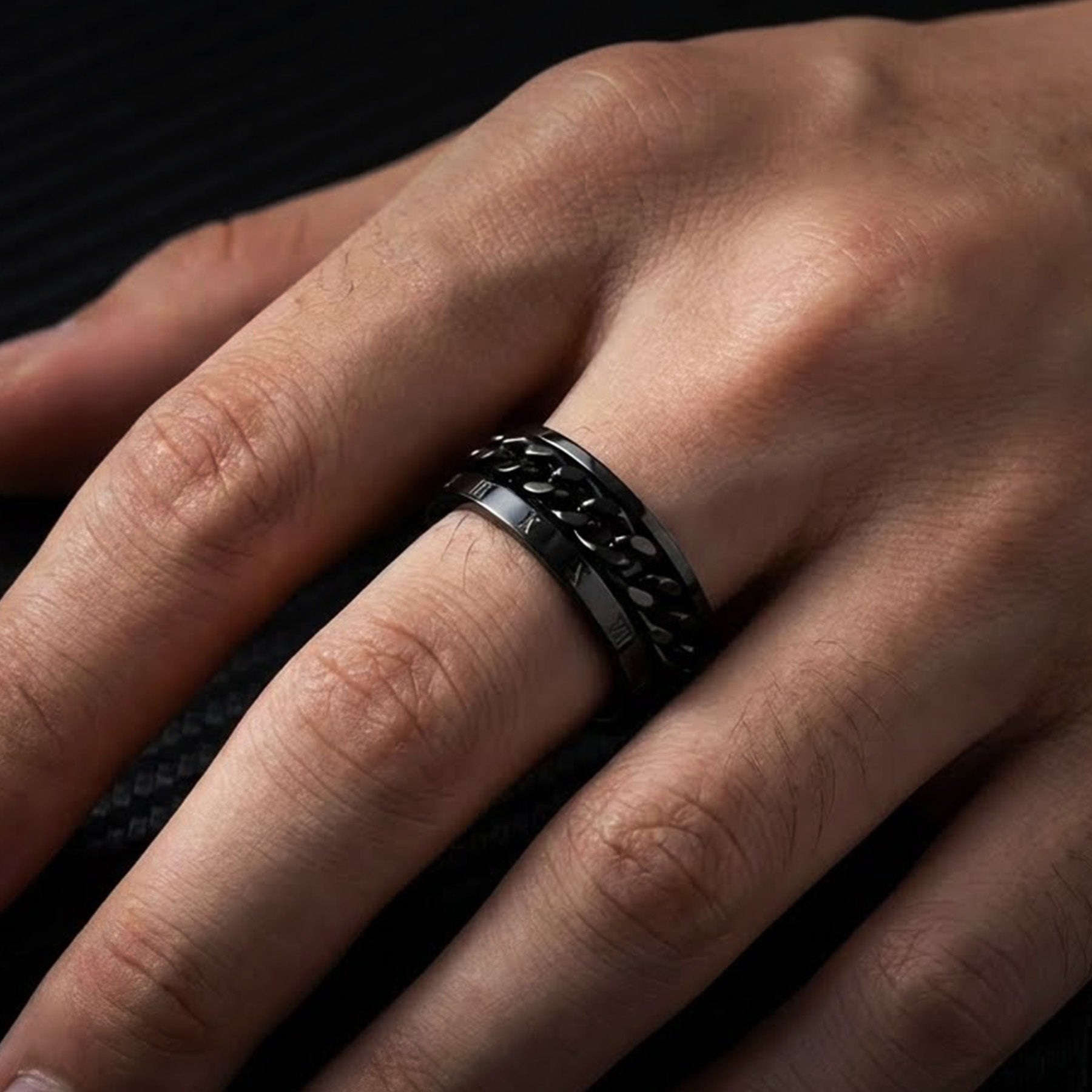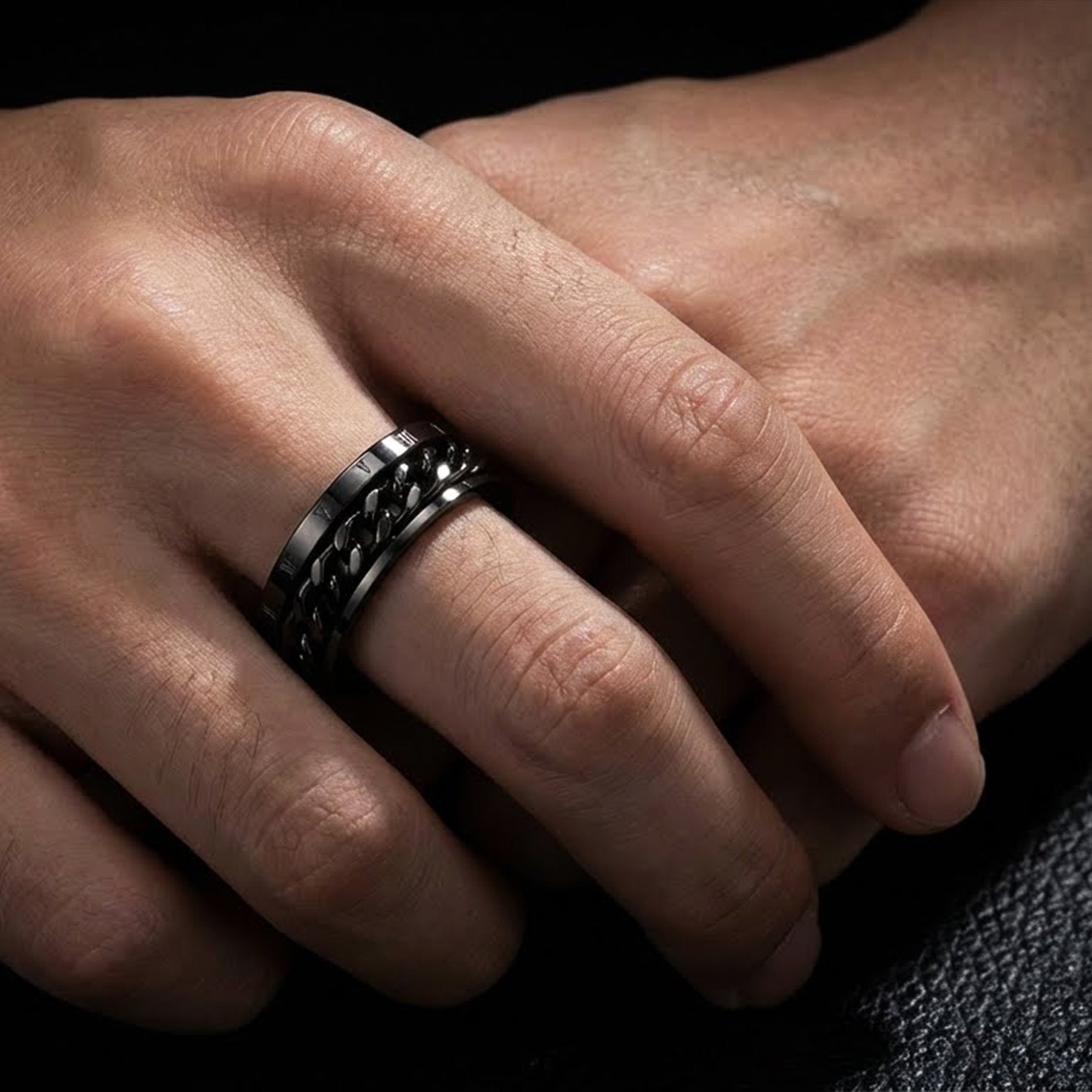 Die drehbare Mitte sorgt für einen beruhigenden Spin-Effekt, der in stressigen Momenten hilft, die Hände zu beschäftigen und den Kopf kurz zu entspannen. Ob beim Warten, Nachdenken oder einfach zwischendurch – der Ring bietet einen kleinen Moment Ruhe.