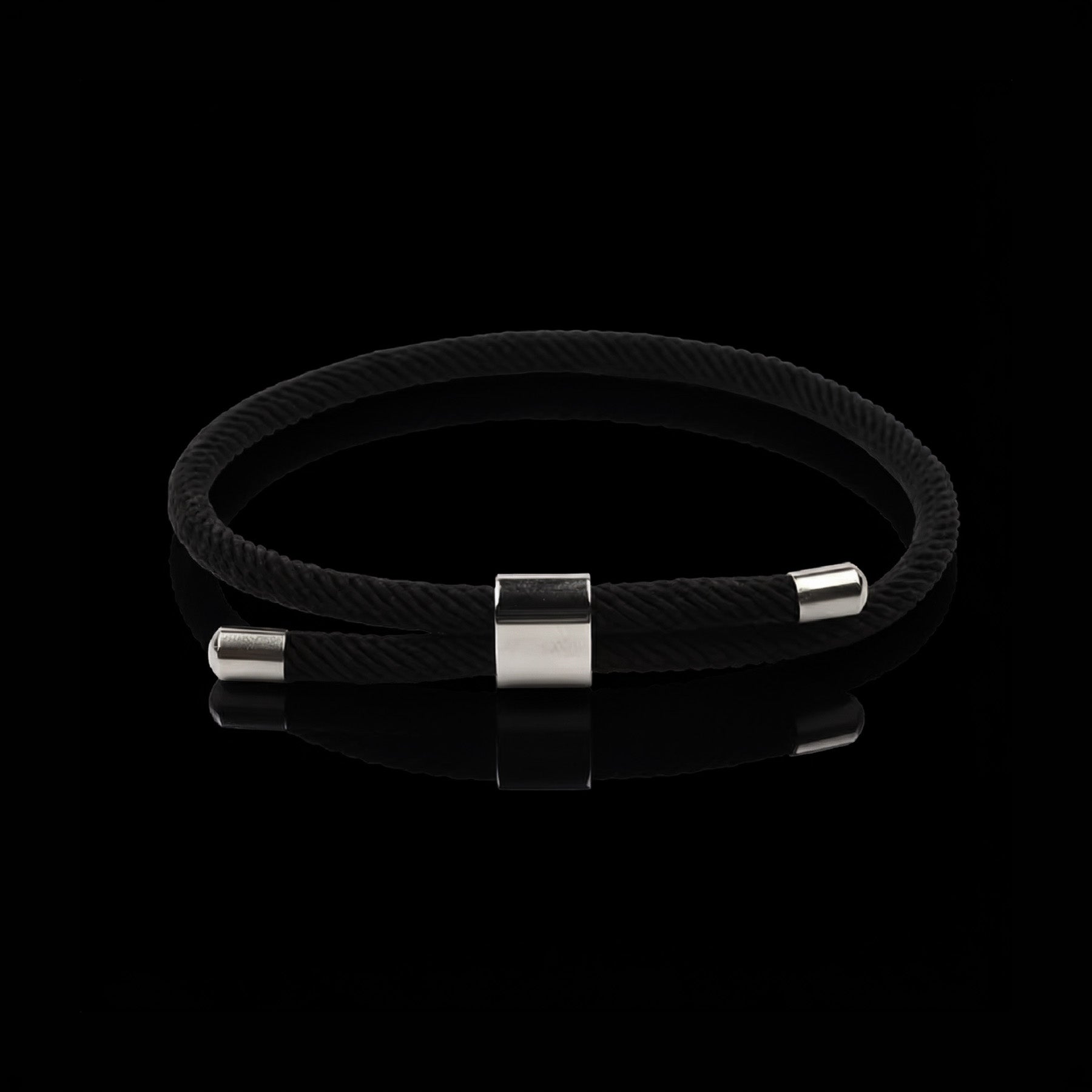 Das Schnu Armband kombiniert minimalistisches Design mit einer modernen, maskulinen Note. Die doppelte schwarze Kordel sorgt für einen sportlich-eleganten Look, während das polierte Edelstahlelement dem Armband einen hochwertigen Akzent verleiht.
