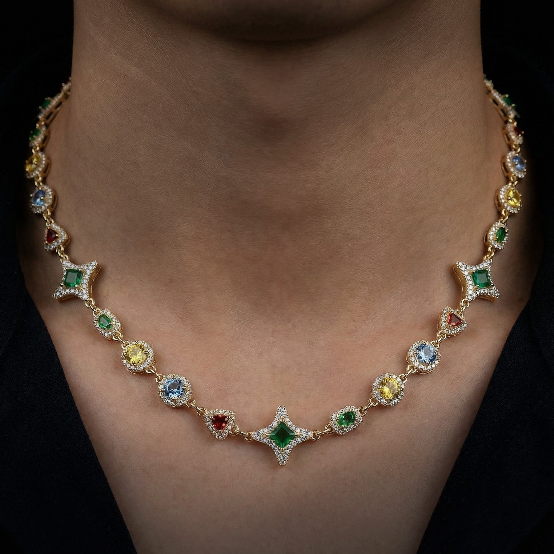 Die Starbunt Kette bringt sofort Leben in jedes Outfit. Die fein gesetzten bunten Steine funkeln bei jeder Bewegung und verleihen dir einen Look, der gleichzeitig edel und modern wirkt.